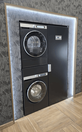 Для ограниченных пространств оптимален монтаж в колонну, при котором стиральная машина служит основой, на неё устанавливается выдвижная гладильная доска, а сверху крепится сушильная машина. Сушильный шкаф размещается рядом. Для такой конфигурации требуется площадь основания около 0,74 м². В более просторных помещениях возможна линейная установка приборов, при которой все устройства размещаются на удобной высоте для легкого доступа.