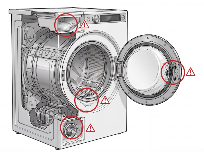 Основные причины загрязнения: жесткая вода (содержание солей >4 ммоль/л), частые низкотемпературные стирки (30-40°C) и избыток порошка. Моющие средства не вымываются полностью и оседают на деталях в виде липкой биопленки. Последствия: