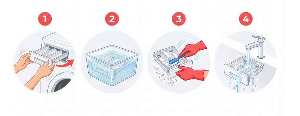 - Очистка ниши (отсека) в машине: Это важнейший шаг. Щеткой очистите внутреннюю часть отсека в самой стиральной машине. Особое внимание уделите форсункам в верхней части и дну отсека, где скапливается слизь.