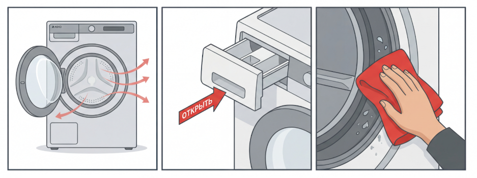 Самая частая ошибка — закрывать люк сразу после стирки. Влажная среда при температуре 25-30°C и влажности выше 70% создает идеальные условия для развития плесени в течение 24-48 часов. Оставляйте дверцу открытой минимум на 2 часа после цикла. Если у вас машина с обычной резиновой манжетой, протирайте её насухо каждый раз. Владельцам техники ASKO проще — конструкция Steel Seal™ исключает складки, где застаивается вода.