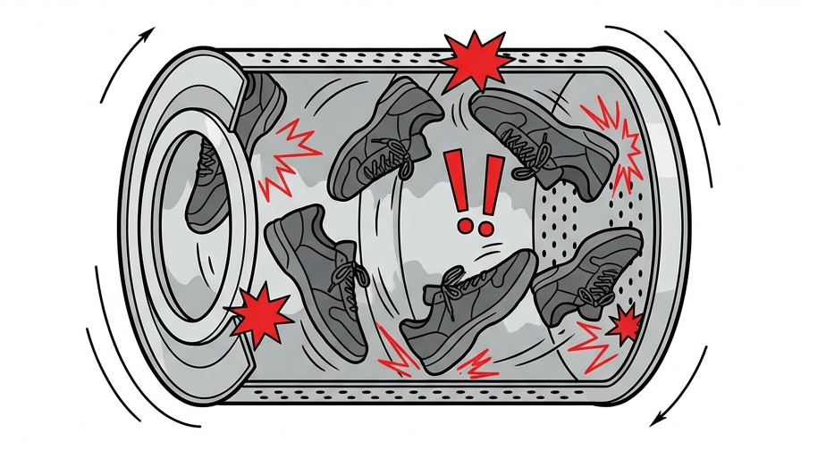 Если обувь помещена в барабан без защиты (стойки, мешка), она может шуметь, тереться о стенки и ускоренно изнашиваться. Чтобы минимизировать ударное воздействие на барабан и материалы обуви, используют сушильные стойки или защитные мешки и выбирают щадящие режимы.