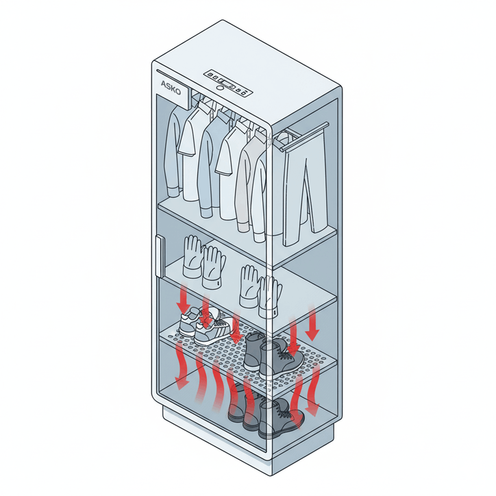В шкафах ASKO специальная полка для обуви имеет перфорацию. Воздух подается снизу (производительность вентилятора до 180 м³/ч, скорость удаления влаги до 17 г/мин). Он проходит через подошву, поднимается внутрь ботинка и выходит через верх. Сквозная циркуляция — это быстрее и эффективнее, чем просто обдув снаружи.