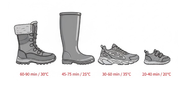 Резина плохо пропускает тепло. Такую обувь лучше сушить в шкафу ASKO, где воздух циркулирует непрерывно и подается снизу через специальную полку. Программа «Экстра» (60°C) справится за 90-120 минут.