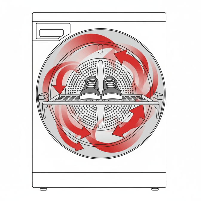 Представьте шкаф, внутри которого обувь стоит неподвижно на специальных полках. Теплый воздух циркулирует вокруг и внутри каждого ботинка. Температура регулируется точно — от 30°C до 60°C. Никакого вращения, никаких ударов.