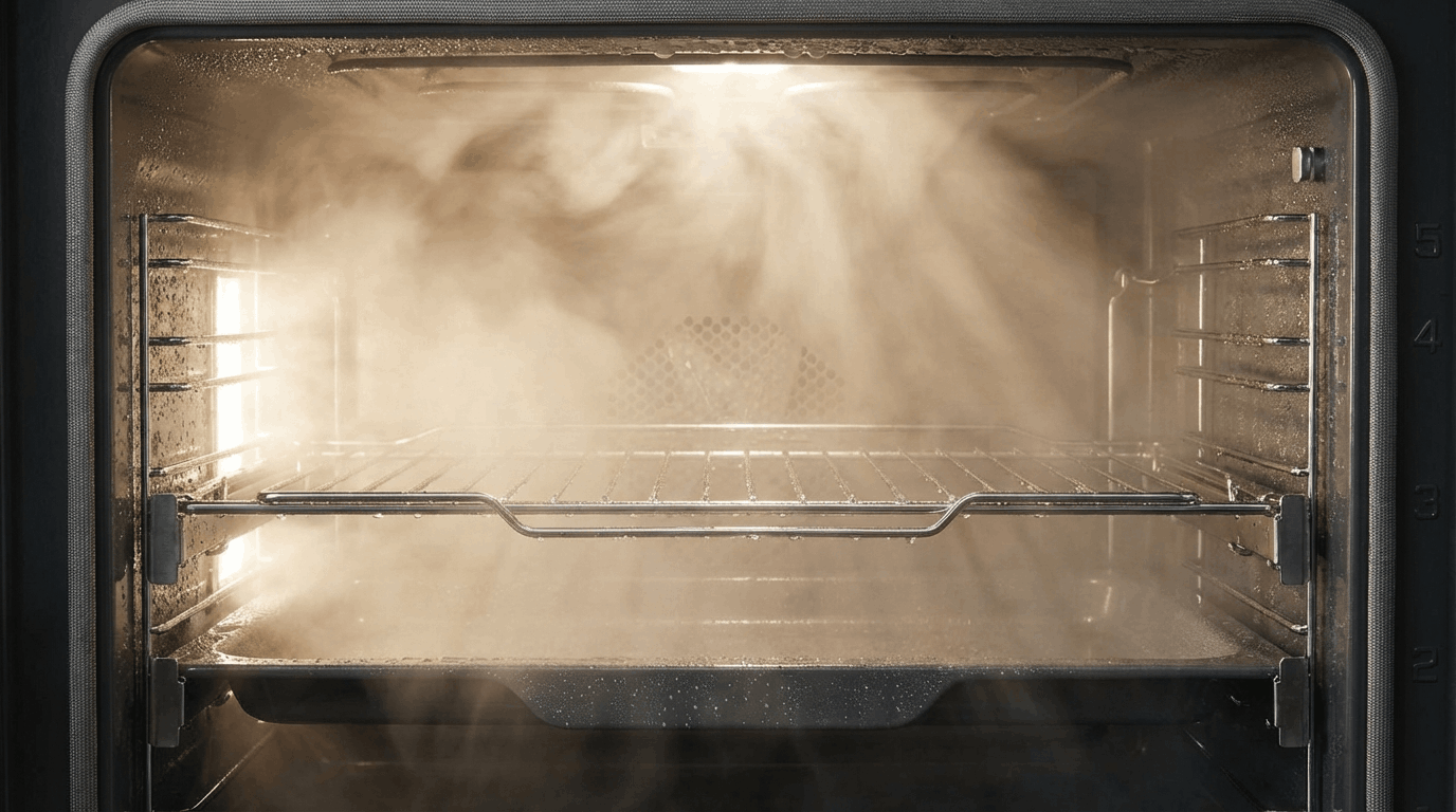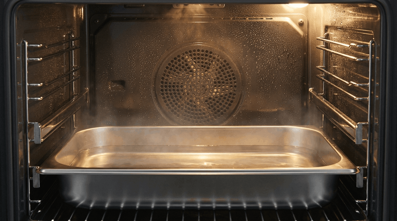 Не добавляйте в воду для гидролиза средства для мытья посуды или агрессивную химию. При нагреве до 90°C мыльный раствор создаст избыточную пену, которая может попасть в систему конвекции, а химические пары осядут на вентиляторе, испортив вкус будущих блюд. Чистой воды вполне достаточно.
