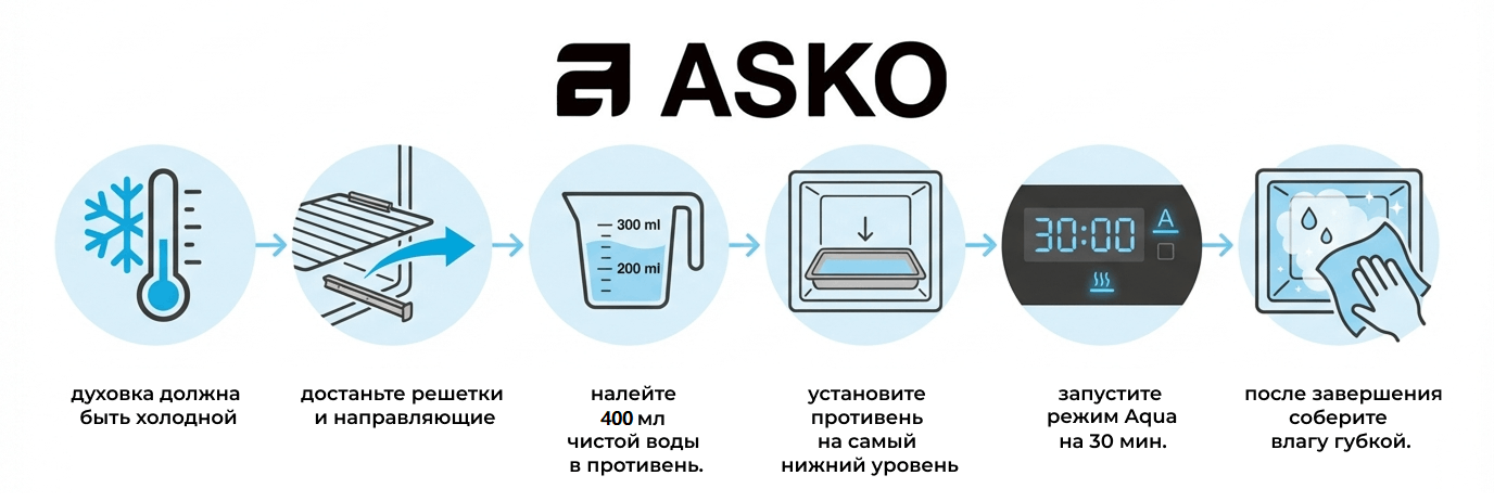 Пошаговый запуск цикла Aqua очистки занимает от 8 до 30 минут в зависимости от модели и требует от 150 до 400 мл воды (за исключением духовых шкафов с паром и 5 в 1 — там вода преобразуется в пар из парогенератора).