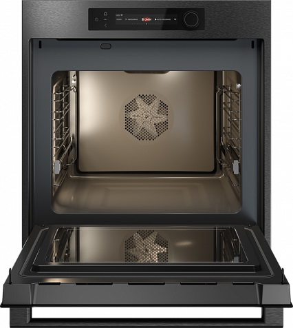 Внутренняя камера покрыта пиролитической эмалью, есть гидролитическая очистка Aqua Clean, телескопические направляющие, сенсорное и поворотное управление с цветным TFT-дисплеем.