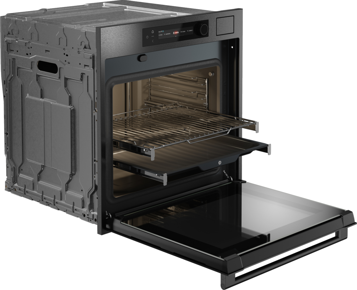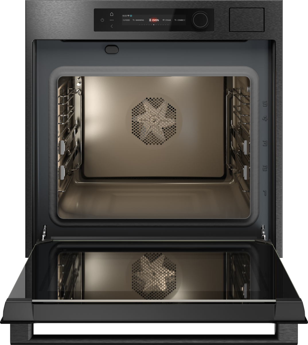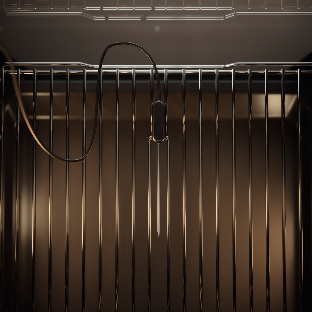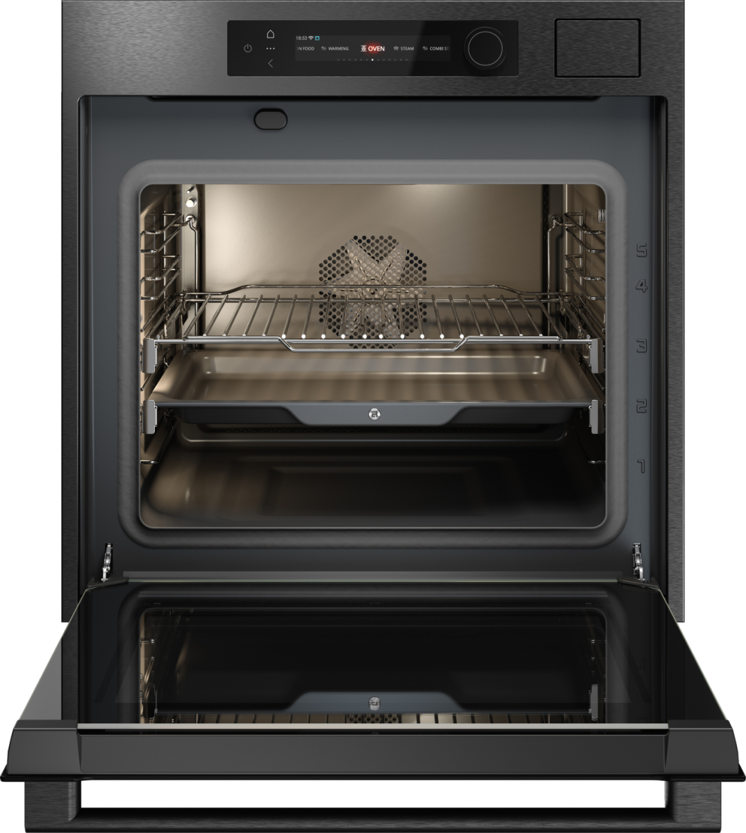 Управление — сенсорное и поворотное, с цветным TFT-дисплеем. Камера покрыта пиролитической эмалью, оснащена LED-освещением с регулировкой яркости и цветовой температуры, а также телескопическими направляющими на двух уровнях.