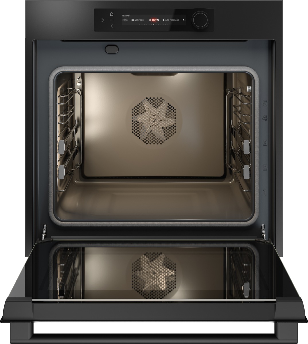 Духовой шкаф выполнен в стильном графитовом цвете, оснащён двусторонним светодиодным освещением с регулировкой яркости и температуры, телескопическими направляющими на 2 уровня и пиролитической эмалью для лёгкой очистки.