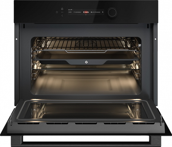 Управление — сенсорное и поворотное, с цветным TFT-дисплеем. Внутри — 4 уровня приготовления, съёмные направляющие и двустороннее галогенное освещение. Очистка — Aqua Clean с микроволнами, внутренняя камера с пиролитической эмалью.